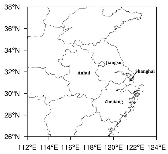 The resolution of the simulated domain, which is centered at Hefei, is 4 km horizontally. The simulated domain is shown in Figure 2. Vertically, there are 50 eta levels and the top pressure is 10 hPa. The time step is 20 s. The main physical parameterization schemes are the Lin scheme [38], the Rapid and Accurate Radiative Transfer Model (RRTM) longwave scheme [39], the Goddard shortwave scheme [40], the Monin–Obukhov (Janjić) scheme [41,42], the Mellor–Yamada–Janjić (MYJ) Turbulent Kinetic Energy (TKE) scheme [41] and the PR92 lightning parameterization scheme [13], which is based on the convective cloud top height. Considering that the 4 km horizontal resolution is the upper limit of the cloud-resolving mode, convective parameterization is not being used.