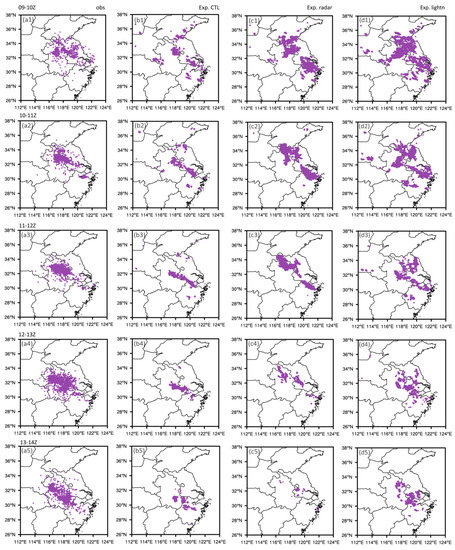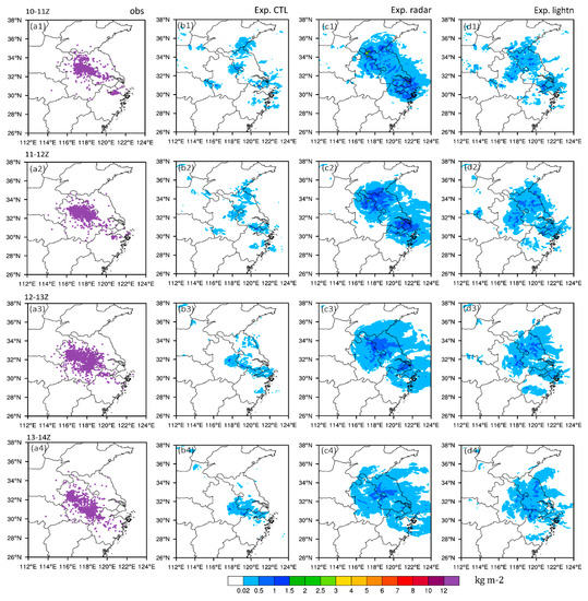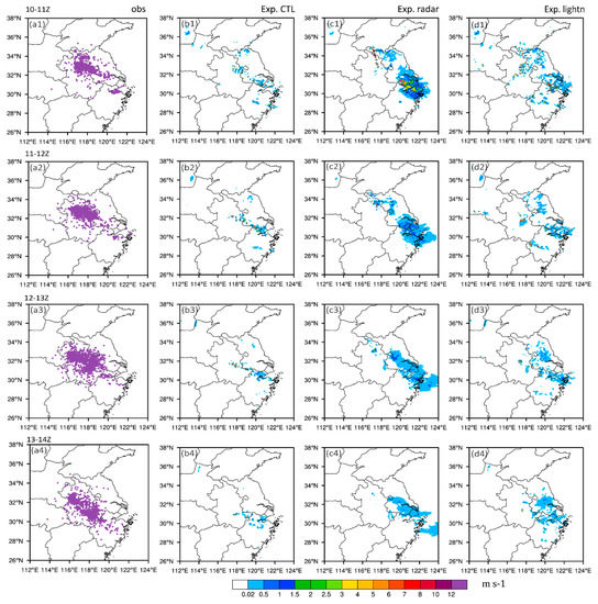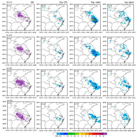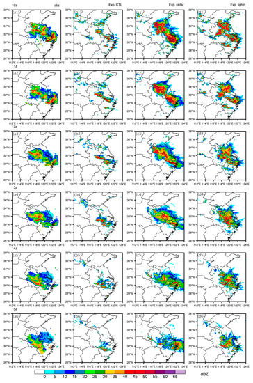 Figure 3 illustrates the observed maximum reflectivity and the forecast maximum reflectivity of all experiments. Columns (a)–(d) are the observed maximum reflectivity and the forecasts of Exp. CTL, Exp. Radar and Exp. lightn, respectively. Compared with the simulation with a resolution of 13.545 km in [28], the simulation with a resolution of 4 km in Exp. CTL captures more high reflectivity centers. However, compared with the observed radar reflectivity, the areas of high reflectivity north of Jiangsu and Anhui Province in Exp. CTL are still missing. After assimilating radar reflectivity, the forecast of the maximum reflectivity in Exp. radar at 1000 UTC improves a lot. The pattern of maximum reflectivity in Shanghai and north of Jiangsu Province is similar to the observed pattern, although there exists an overestimation in strength, while in Exp. lightn, the forecast maximum reflectivity is closer to the observed reflectivity. Compared with Exp. radar, the reflectivity in the central part of Anhui Province is better adjusted and the overestimation is lower than that of Exp. radar. In the time interval of 1400–1500 UTC, the main convective cell is located south of Anhui Province and west of Zhejiang Province. While the high reflectivity of the Exp. radar located in Shanghai and south of Jiangsu Province, which locates to the east of the observation. The forecast maximum reflectivity in Exp. lightn is located east of Anhui Province and north of Zhejiang Province, which provides a better location forecast than Exp. radar. From 1000 to 1500 UTC, the forecast maximum reflectivity of Exp. CTL and Exp. lightn are overestimated. However, as the integration time increases, the overestimation is not so obvious as the forecast is approaching to the observation. The improvement of forecast maximum reflectivity in these two assimilation experiments is well maintained and can last for more than 6 h. In all, the first three hours forecast after assimilating the lightning data in Exp. lightn are overestimated, while the overestimation is lower than that of Exp. radar. In the following several hours, the pattern of maximum reflectivity maintains well and part of the high reflectivity is similar to the observed reflectivity.