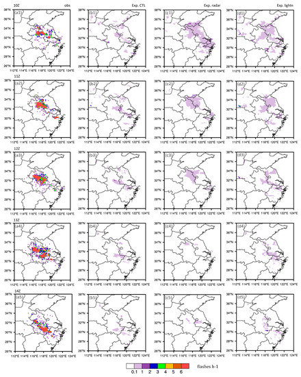 The observed cloud-to-ground lightning rate (unit: flashes·h−1) (a) and forecast accumulated cloud-to-ground lightning rate (unit: flashes·h−1) of (b) Exp. CTL, (c) Exp. radar and (d) Exp. lightn hourly from 0900 to 1400 UTC. Row 1 to 5 represents different time point from 0900 to 1400 UTC.