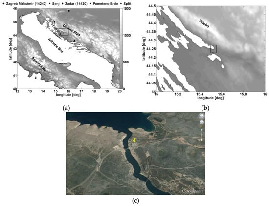 (a) The Adriatic coast with locations of previous bora studies marked (Senj and Pometeno Brdo near the city of Split). The Zadar and Zagreb Maksimir sounding stations are also marked. The box represents the area of this study. (b) shows the zoomed in view of that area, while (c) shows the zoomed in view of the measurement site at the Maslenica Bridge (shown as the box in b). The Velebit Mountain is mostly north of the site.