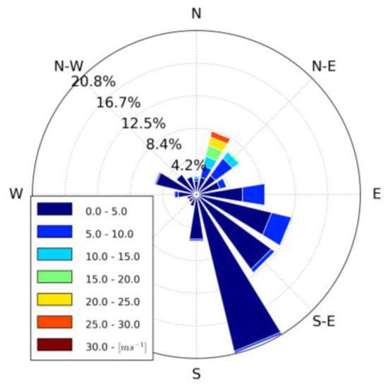 The wind rose from 10-min wind averages of all data. The wind speed category limits are in m·s−1, and the numbers on the plot indicate the relative frequency of occurrence.