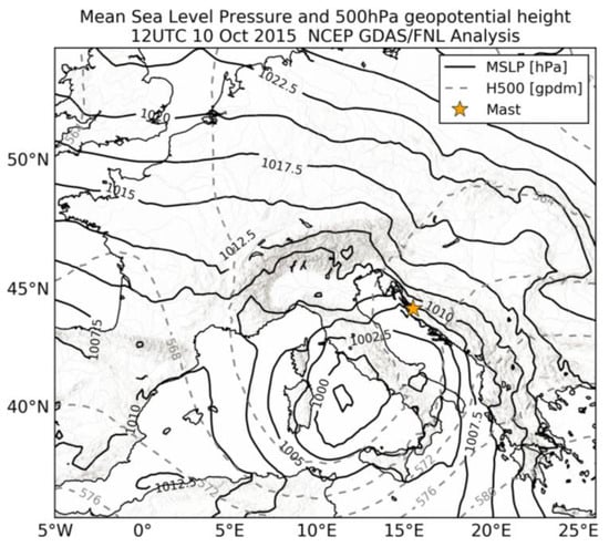The surface analysis (NCEP GDAS/FNL) mean sea level pressure (solid line) and geopotential height at 500 hPa (dashed line) for 12 UTC on 10 October 2015. The bora episode B01 (SC). The measurement site is marked with the orange star.