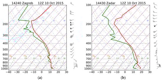 The skew-T log-P graph of sounding data from the Zagreb (a) and Zadar (b) stations at 12 UTC on 10 October 2015. Bora episode B01 (SC). The vertical axis (pressure) is in hPa and horizontal axis (temperature) is in °C.