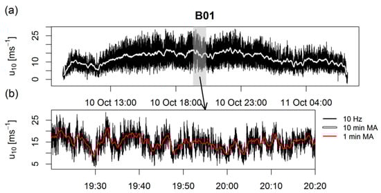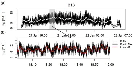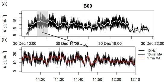 The bora episode B09 has somewhat lower wind speeds in the middle and higher wind speeds after the beginning and before the weaker end of the episode. The zoomed data (Figure 8b) with 1-min moving average shows the superposition of pulsations with varying periods (around 3–5 min). Some of the pulsations have estimated amplitudes over 10 m·s−1.