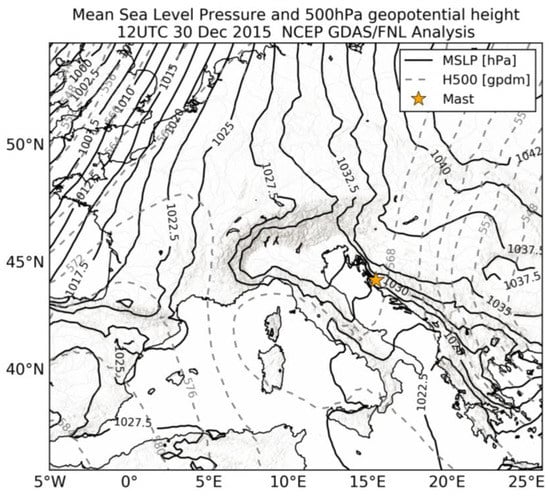 For episode B09 (DA) surface analysis at 12 UTC on 30 December 2015 (Figure 6) features a strong anticyclone (1045 hPa at the center) influencing most of Europe (a larger-area surface analysis can be found at []).