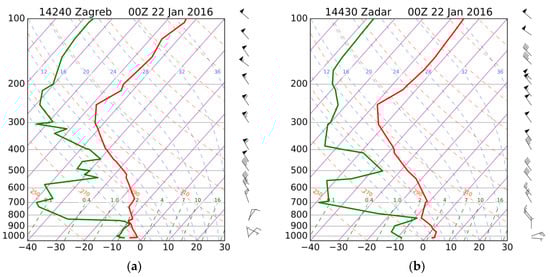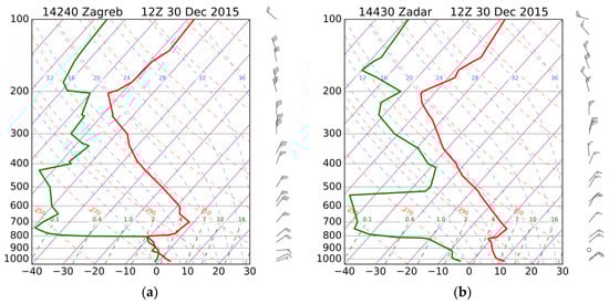 Deep N/NE flow can also be seen in the Zagreb sounding (Figure 7a), together with strong subsidence inversion at 800 hPa—a typical signature of such a strong anticyclone. The Zadar sounding (Figure 7b) features a similar wind profile, with somewhat weaker subsidence inversion.