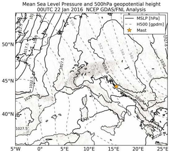 The surface analysis at 00 UTC on 22 January 2016 (Figure 9), 11 h after the beginning of the B13 episode (SA), shows a weak anticyclone with the center over Central Europe.