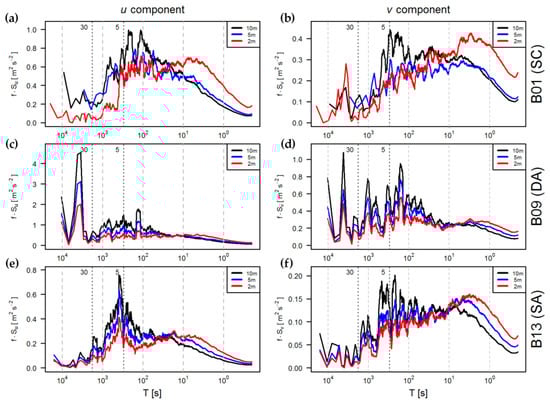 Before Reynolds decomposition, the mean wind direction was determined for each bora episode and the coordinate system was rotated, so the x-axis points downstream of this mean wind speed. The power spectral densities were calculated for the horizontal components (u and v) of wind speed using the Welch algorithm [] and then smoothed using the frequency window that expands in width with frequency []. This frequency smoothing is needed to obtain representative spectral curve from the estimates, which exhibit excessive crowding and large scatter at the high-frequency end on a logarithmic scale.