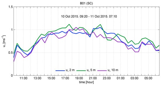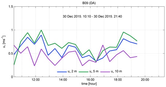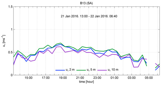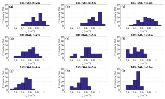 Other two anticyclonic bora episodes seem to have such distribution types shifted towards lower values of friction velocity (maximum located around 0.5 m·s−1) compared to bora B01 (SC). A slight negative skewness can be noticed for those bora episodes, and is also evident as somewhat larger medians compared to the corresponding mean friction velocity.
