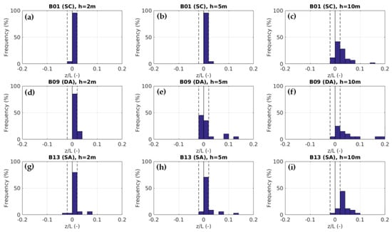 The stability parameter ζ distribution for the B01 (a–c), B09 (d–f), and B13 (g–i) bora episodes at three different vertical levels: 2 m (a,d,g), 5 m (b,e,h), and 10 m (c,f,i).