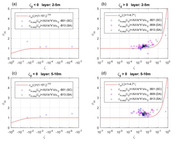 In the lower layer (2–5 m), the experimental values have lower dispersion (Figure 18a,b). Furthermore, they show a reasonable trend of increase when the lowest part of the atmosphere becomes more statically stable, and decrease when it becomes more unstable, which is in accordance with the theoretical expressions. This trend is not so obvious in the upper layer (5–10 m). It can be concluded that the universal similarity functions are relatively successful at describing the wind profile in the lower part of the surface layer, but fail to give reliable results above a certain height. Therefore, the use of the universal similarity functions should probably be avoided in case of bora wind or at least used with caution.
