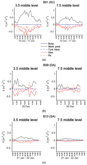Figure 19 represents the TKE budget terms as defined in Equation (8) (Section 2.8) for the three selected bora episodes: B01 (SC; Figure 19a), B09 (DA; Figure 19b) and B13 (SA; Figure 19c).
