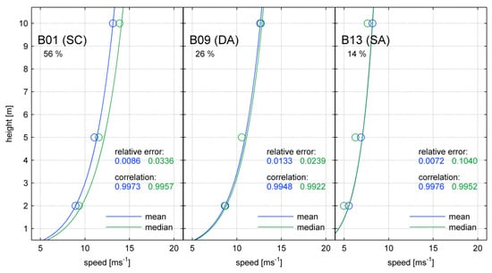 The vertical wind speed profiles reconstructed with the mean and median values (Section 2.9) are shown in Figure 20. Both methods of reconstruction gave results with high correlations (between 0.9874 and 0.9995) and small relative errors.