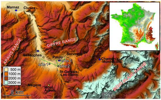 A recent field experiment (Passy-2015) dealing with air pollution and wind dynamics took place in the vicinity of the town of Passy in the Arve river valley in 2015. This location in the French Alps close to Mont-Blanc is one of the worst places in France regarding air quality. European standards state that the daily-averaged concentration of PM10 of 50 g·m must not be exceeded, with a tolerance for 35 exceedances per year (directive 2008/50/EC). These limits are regularly exceeded near the town of Passy. For instance, during the winter of 2016–2017, the local air quality agency reported that 30 consecutive days were over the limit during a single pollution episode [28]. Besides the large PM10 concentration recorded in winter, strong spatial heterogeneities are observed over a few tens of kilometres within this narrow steep-sided valley. These heterogeneities may be due to variations in emission rate and/or to local dynamics. To evaluate the role of the local dynamics, a better understanding is needed. This was the main motivation for the Passy-2015 field experiment that took place during winter 2014–2015 in the Arve river valley [29].