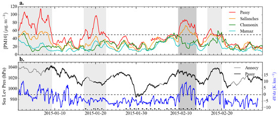 Figure 2b displays the time evolution of the sea level pressure (Psea) measured in the middle of the Passy basin. In addition, the Psea time series recorded by the METEO-FRANCE automatic weather station at Annecy, 45 km west of the Passy basin, is represented. The two series are very close, with an average difference of 0.65 hPa and a maximum difference of 3.5 hPa. Annecy Psea measurements can therefore be used to complete data missing from the Passy Psea series. The temperature gradient between 540 and 1833 m ASL is represented in blue. It was computed using METEO-FRANCE automatic weather stations of Sallanches (541 m ASL) and Mont-Arbois (1833 m ASL). It appears that pollution episodes occur during anticyclonic conditions, which favour the development of persistent temperature inversion (), as already noted by [34,35,36].