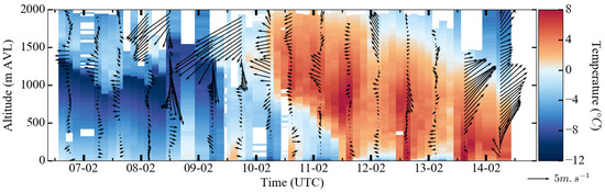 Figure 3. Space and time (z,t) diagram of temperature obtained from high-frequency radiosoundings launched from the Passy basin centre (Site 1) during IOP1. Wind profiles are superimposed with wind direction given by the arrow orientation (a northerly wind points towards the bottom) and wind force given by the vector length. - the stagnation stage: from 10 to 12 February, the capping inversion persisted over the period with its top lowering slowly day by day. A ground-based inversion developed at night and was destroyed in the early afternoon because of weak convection. The maximum intensity of the temperature inversion was reached on 11 February at 6:00 a.m. UTC.
