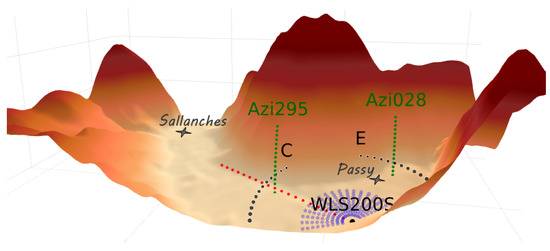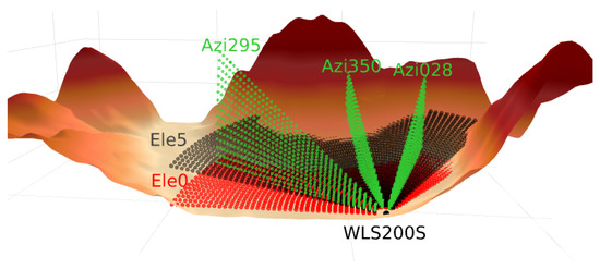 - An horizontal Plan Position Indicator scan (PPI) every 10 min. This was obtained by the lidar beam scanning in azimuth, between 250° and 60° with respect to the north, while keeping the elevation angle at 0° (in red in Figure 4). Horizontal PPIs allowed the structure of the horizontal valley wind, 40 m AVL, to be investigated.