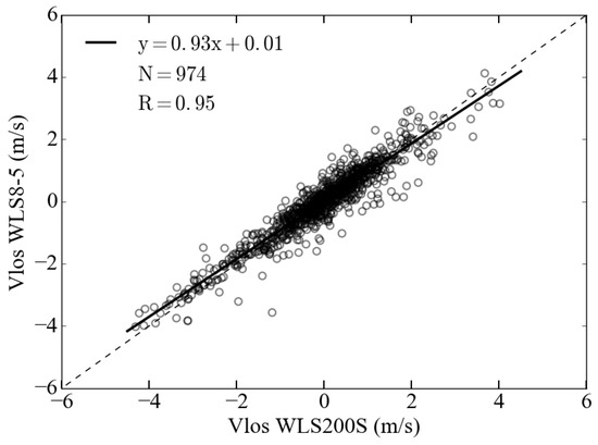 In this section, , measured from the WLS200S, and the same quantity derived from zonal and meridional velocities measured by the WLS8-5, are compared. DWL profilers have been used increasingly for atmospheric and wind turbine studies in the last decade. Comparison studies have shown very good agreement with readings from mast-mounted anemometers, with a correlation coefficient [42], or with radiosonde wind measurements [43]. The WLS8-5 is thus considered as a reference in the current study.