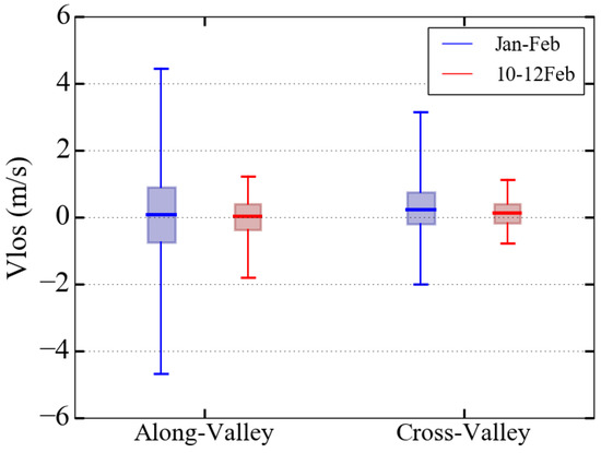 This section aims to provide a general overview of the wind distribution under stable conditions compared with more vertically mixed conditions. Figure 6 represents box plots of extracted at 40 m AVL at two locations within the basin. These locations were chosen so that characteristics of the along- and cross-valley wind components could be inferred. Along (cross) valley components were extracted at azimuth 287° (350°) and 2600 m (700 m) from the lidar. Blue boxes represent the January–February database (Jan–Feb), which contains a large range of wintertime atmospheric conditions and associated wind patterns. Red boxes correspond to the stagnation stage of IOP1, described in Section 2.2 (10–12 Feb). The bottom and top of the box correspond to the 25th and 75th percentiles and the whiskers extend from the 1st to the 99th percentile, meaning that of the database is between the two whiskers.