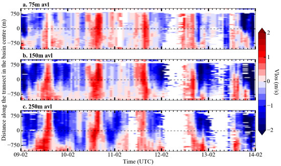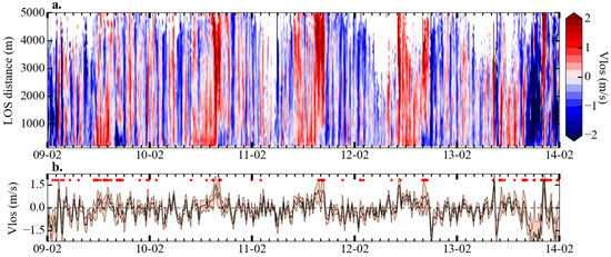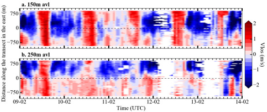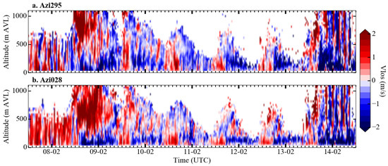 - the Line-Of-Sight velocity () in m·s. Negative velocities represent a flow toward the lidar while positive velocities indicate a flow away from the lidar. To facilitate the plot interpretation, a convention based on the north–south or west–east direction is applied in this study whenever possible, and is specified in the figure caption.