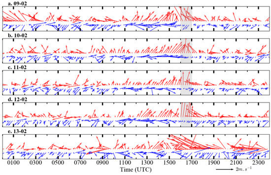 Figure 8a shows the onset of the up-valley wind in the valley centre, which occurs around 10:00 a.m. UTC and coincides with the vertical range increase. The mean up-valley wind intensity and depth tend to decrease during the stagnation stage. The layer develops up to 500 m AVL on 9 and 10 February, then decreases to a depth of around 200–300 m AVL on 11 and 12 February.