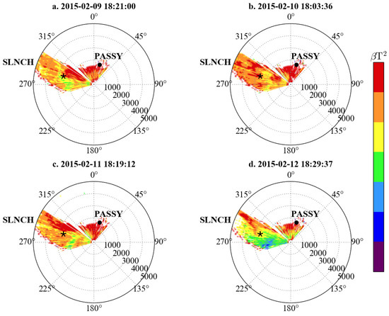 - the Carrier to Noise ratio (CNR) in dB, corresponding to the ratio of the power of the received heterodyne signal to the noise power. The CNR depends, among others things, on aerosol content and can be expressed by the Equation (1) [41]:where R represents the distance from the lidar in the LOS direction, is the backscatter coefficient, is the atmospheric transmission (with being the extinction coefficient) and ) gathers together the geometric dependences on R, including the heterodyne efficiency, which mainly affects the signal in the nearest range gates. The CNR gives an indication of the measurement quality and is used for data quality checking (Appendix A).