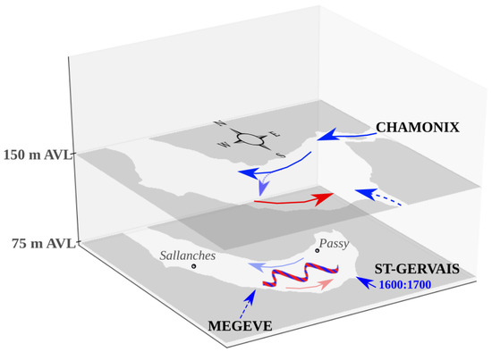 During the daytime, a continuous up-valley wind blows over the whole basin width. At a maximum mean velocity of 1.5 m·s over a mean duration of 5 h, pollutants would travel a maximum distance of 27 km upstream, which is similar to the valley length (23 km). Under very stable conditions, the Chamonix are below 50 g/m (Figure 2). Therefore, it is probably that the polluted up-valley wind does not reach the upstream town and remains blocked by the Servoz sill. The current database does not allow for investigating the trajectory of the air masses beyond the Passy town but several hypotheses can be considered. The polluted air mass can recirculate at a higher level in the opposite direction or be evacuated along the basin sidewalls by the up-slope circulation.