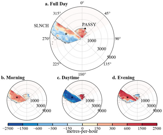 Horizontal map of ventilation index obtained from PPI scan, 40 m AVL for (a) the full 11 February, (b) the early morning stage [0:00 a.m.:10:59 a.m.] UTC; (c) the daytime stage [11:00 a.m.:4:59 p.m.] UTC; and (d) the evening stage [5:00 p.m.:11:59 p.m.] UTC. Blue represents ventilation in the toward-lidar LOS direction and red represents ventilation away-from-lidar, which is located at the centre (0,0). The black star indicates the location of Site 1 within the Passy basin and the black dot shows the location of the TEOM-FDMS station, which measured at Passy. The Sallanches station (SLNCH) is out of the plot, km away the center in the west–northwest direction, close to the southern sidewalls of the basin (blue star in Figure 1).