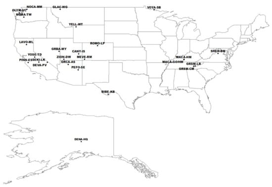 The data used in this study were collected by the NPS Gaseous Pollutant Monitoring Program (NPS GPMP) (http://ard-request.air-resource.com/) []. Ozone is the primary gas monitored throughout the network that follows all the EPA protocols and is certified annually by the NPS to the EPA. The certification is supported by the Quality Assurance Project Plan (QAPP) [], which specifically addresses the procedures used by the NPS to operate and certify ozone measurements at NPS-operated sites with EPA-certified analyzers. The data sets used here were all acquired from regulatory ozone monitoring stations; the sampling methods for gaseous and meteorological monitoring are based on the 40 CFR Part 58 requirements. All GPMP ambient ozone data is processed through several layers of rigorous validation by staff analysts. To ensure that each GPMP site and ozone monitor is operating properly and calibrated correctly, the full suite of GPMP network data are reviewed daily by a different independent analyst []. All data analysts all of which follow the same quality assurance/quality control (QA/QC) protocols that are set by the QAPP []. Bias and error in the data are determined by finding the deviation from the “true value” as a percentage of the true value []. Data analysts also monitor the amount of valid data acquired from each site and compare it to the expected amount under normal conditions in order to assess that data completeness criteria requirements are either met or to immediately identify a problem at a site. Additionally, the comparability of the data sets are monitored to ensure all final validated data is meaningfully comparable. Data validation for the entire GPMP network is performed monthly and uploaded to the EPA Air Quality System (AQS) database and is made available on the NPS Data Request web page. Further details regarding site operation and data processing can be found in the GPMP QAPP [].