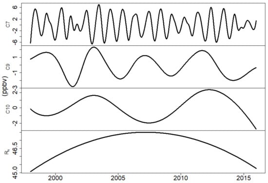 The ozone data were decomposed into 12 oscillatory components using EEMD. For this study, we will focus on three of these components, including the 7th, 9th, and 10th component, and the residual, which were referred to as C7, C9, C10, and Rn, respectively. Our components of interest vary annually, interannually (by ENSO and PDO), and, as mentioned in Section 2, the residual Rn is the multidecadal variability. The components of interest at one site, ROMO-LP, are shown in Figure 2 as an example of EEMD results.