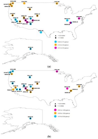 It is worth noting that the trends at 20 out of the 25 sites changed from positive to negative at some point in time during the study period, and a clear divide in the date of the trend change was observed. Additionally, the trends at sites in closer proximity to regions of higher population changed before 2004, while those at sites in the West and Intermountain West changed during or after 2004. Therefore, the rates of positive and negative trends were identified with the date of trend change as occurring either before 31 December 2003 or after 1 January 2004. The monitoring at MACA-GO ended in 1997 and was replaced by MACA-HM, which is seven miles away, in the same year; therefore, trends in this region were considered to have changed from increasing to decreasing in the year 1997. Excluding MACA-GO, two sites exhibited constant increasing trends (BIBE-KB (TX) and GLAC-WG (MT)), and one with a constant decreasing trend (PINN-ES (CA)).