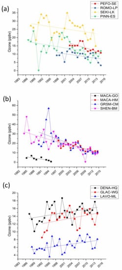 - Parrish, D.D.; Petropavlovskikh, I.; Oltmans, S.J. Reversal of Long-Term Trend in Baseline Ozone Concentrations at the North American West Coast. Geophys. Res. Lett. 2017, 44, 10675–10681. [Google Scholar] [CrossRef]
