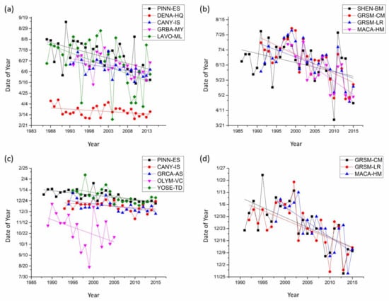 A shift to earlier in the year was observed in the annual maximums and minimums at 17 of the 25 sites. Sites with a significant shift are indicated in Figure 5. Figure 5a,b depict the nine sites that had a significant shift in peak date with 5 in the West, including the one site in Alaska (DENA-HQ) (Figure 5a), while Figure 5b shows four sites in the East. The sites with significant peak shifts in the West had shifted 10 to 60 days earlier during their respective monitoring periods (Figure 5a), while in the East, sites have moved 35 to 60 days earlier (Figure 5b). A closer examination revealed that the annual peaks at eight of the nine sites occurred in June and July prior to 2000, but afterward gradually shifted to late April/early May (Figure 5a,b). The annual maxima at DENA-HQ in Alaska shifted earlier by 10 days from early April in 1987 to late March beginning around 2003 (Figure 5b). Eight sites had an earlier occurring annual minimum, while four of these sites also had a shifting annual maximum (Figure 5c,d). Five of the eight sites with shifting annual minima were in the West, while the other three reside in the East. The annual minimum shift was more significant in the three eastern sites (28–34 days) than the five western sites (14–21 days).