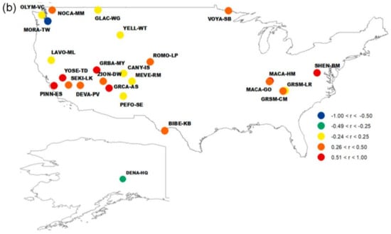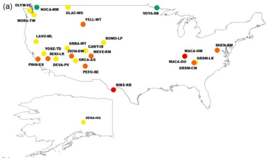 There was greater regional continuity in the East than the West, with four out of six sites showing significant decreases in the magnitude of annual amplitude (Figure 4b), four out of six sites with a significant shift in annual maximum (Figure 5b), and three out of six sites with a significant shift in annual minimum (Figure 5d). In comparison, 5 out of 19 west coastal sites have had changes in the magnitude of annual peaks and minimums. Of the sites in the West, three out of four sites had significant decreases in annual amplitude. Three out of five, and four out of five sites for annual maximum and minimum, respectively, were located in the regions with the earliest shift in trends from positive to negative (Figure 5a,c). Parrish et al. [] suggested that the shift in the seasonal cycle may be a phenomenon occurring across northern mid-latitudes. Our study suggests that this shift did not seem to occur uniformly at all mid-latitudinal locations, as overall across the U.S. 9/25 (8/25), NPS sites have had a change in timing of annual maximums (minimums), and 11/25 have had a change in annual amplitude.