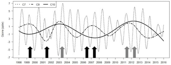Individually, components C9 and C10, or variability by ENSO and PDO, contribute about 1–2% to the variance in ozone concentrations. However, both of the components have a modulating effect on the seasonal cycle as well as subsequent higher frequency components. The modulation effect of lower frequency signals on higher frequency signals can be illustrated using the seasonal cycle of Rocky Mountain National Park (ROMO-LP). In Figure 7, signals of the seasonal cycle (C7), ENSO (C9), and PDO (C10) for Rocky Mountain National Park (ROMO-LP) are superimposed. Black arrows indicate that ENSO and PDO are out-of-phase, while gray arrows indicate that the components are in-phase. For example, in spring 2003, 2011, and 2012 the seasonal cycle was enhanced by 3–4 ppbv from the previous year, while ENSO and PDO were in phase. Therefore, when ENSO and PDO act in concert and the regimes in these climate modes have reached a peak, maximums in the seasonal cycle were enhanced. Modulation, or the enhancement of the seasonal cycle, by lower frequency components occurs at all sites in the study domain.