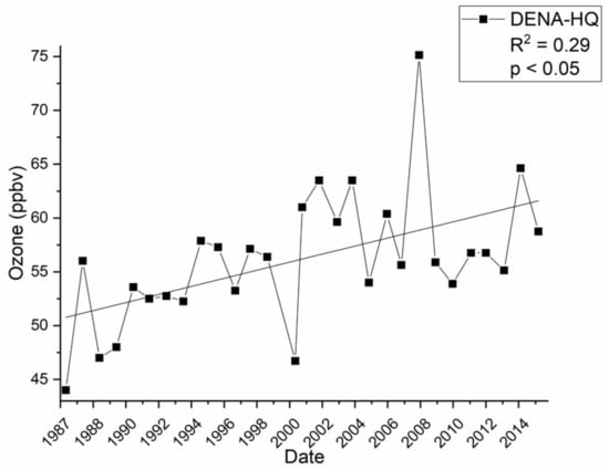 4.4. Increasing Annual 4th-Highest DM8HA and Annual Amplitude of Ozone at DENA-HQ over 1987–2015