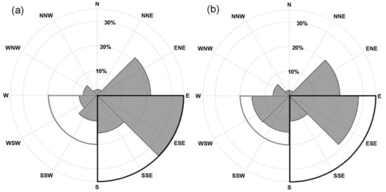 The percent of trajectories that fell in 8 radial sections around DENA-HQ. Rolling seven-day back trajectories were calculated using the Hybrid Single Particle Lagrangian Integrated model (HYSPLIT) model. Trajectories were calculated seven days before and after the date of the annual 4th-highest DM8HA at DENA-HQ for the periods 1987–1998 (a) and 1999–2015 (b). The grey boxes indicate the area where an increase in trajectories were seen from period one (a) to period two (b) and the black box indicates where a decrease in trajectories were seen from period one (a) to period two (b).