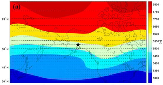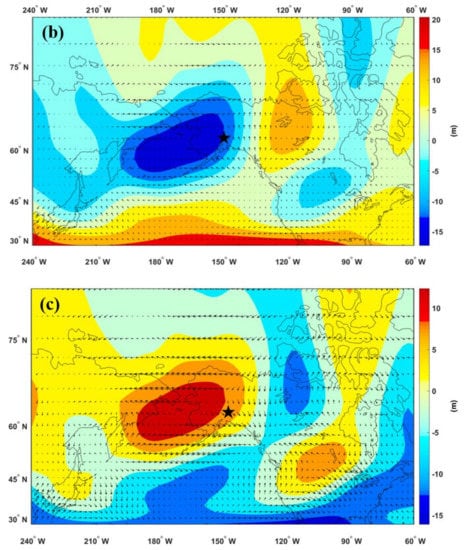 To determine the key factors driving the variability in the direction of backward trajectories between the two periods (1987–1998 and 1999–2015) for the months of April and May, monthly mean geopotential height fields with wind speeds at 500 hPa for 1987–2015, 1987–1998 (period one), and 1998–2015 (period two) were examined for April and May during each period (Figure 10). Anomalously low geopotential heights occurred to the west of Alaska for period one (Figure 10b); during period two, anomalously high geopotential heights occurred in the same area (Figure 10c). These findings are in agreement with Bond and Harrison’s [] study on the variability and relationship between ENSO and the Arctic Oscillation on the climate of Alaska, but for the winter months of November through February. The increased number of El Niño events that occurred during the positive PDO phase over 1987–1998 resulted in a low-pressure system to the southwest of Alaska during April and May, the months when transport over the Pacific is the greatest [], allowing for air masses to preferentially move from the U.S. West Coast and the marine regions south of Alaska. During the second period 1999–2015 in the months of April and May, a high-pressure system resulted in increased westerly flow across the North Pacific to DENA-HQ and a decrease in the air masses from the marine regions south of Alaska. Air masses originating from this region for the week before and after a peak ozone event in at DENA-HQ are presumably more polluted. It is likely that there was pollution outflow during these times from East Asia, causing the increase in ozone at this site. Therefore, the changing circulation regimes enhanced the transport of western polluted air masses to Alaska during period two, ultimately leading to the increasing trends in the annual 4th highest DM8HA values and the magnitude of the annual amplitude after 1999 at DENA-HQ.