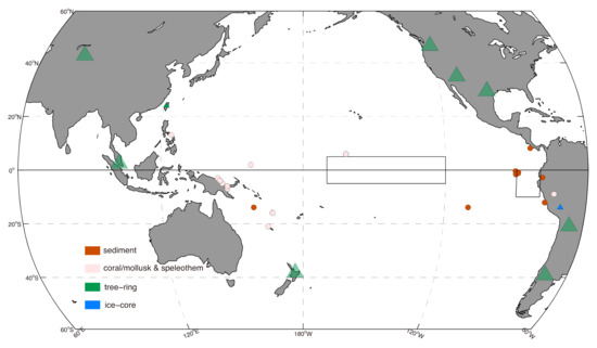 South America coastal regions and nearby islands in the tropical eastern Pacific, located in the ENSO center of action, are ideal regions to search for information on past ENSO variability. Early archaeological records [45] and later high-resolution lake sediment records showing variations in sediment composition [22,23,24,26,46] have been collected. These radiocarbon-dated records are usually continuous in time and can date back thousands of years in the past. To reconstruct ENSO history over the last few centuries, tree ring data has been used (see a synthesis by Li et al. [36]). Strong ENSO signals have been detected in tree rings from the tropics and the mid-latitudes. Recently, tree-ring cellulose δ18O, instead of the conventional width, was also measured to infer the SST change over the tropical central Pacific [37,47]. On rare occasions, oxygen isotope ratios from ice cores at low latitudes can provide a high-resolution record of climate variability in the tropics during the last millennium [38]. All these circum-Pacific proxy reconstructions are interpreted as anomalous regional weather or climate patterns, which are linked to the SST variability in the tropical Pacific.