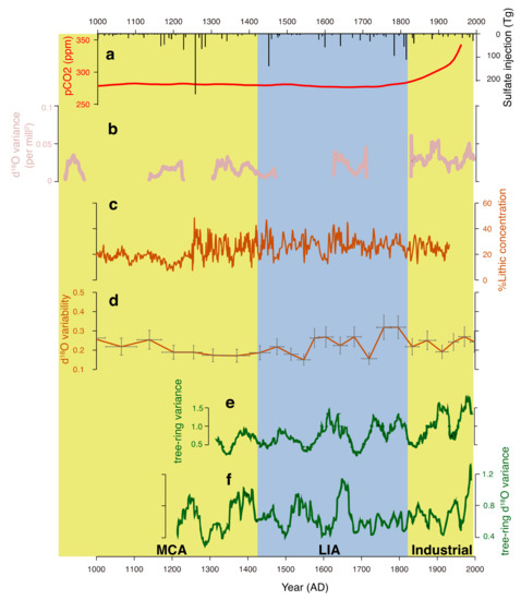 The existence of many long, high-resolution paleoclimate records from the circum-Pacific regions paints a relatively detailed picture of ENSO variability in the last millennium. In particular, paleo ENSO studies for the past millennium have been focusing on resolving the dynamical connections between ENSO processes and centennial Northern Hemisphere (NH) climate anomalies [69]—notably the warm Medieval Climate Anomaly (MCA, ~900–1450 CE), the cold Little Ice Age (LIA, ~1450–1850 CE) and then an industrial global warming. Volcanic eruptions inject aerosols into the atmosphere and impact the global climate through radiative forcing and complicated interactions with clouds [70,71]. The last millennium is an ideal period to investigate the ENSO sensitivity to radiative forcing induced by large tropical volcanic eruptions that are well documented [72] (Figure 2a, black bar).