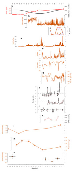 Sadekov et al. [30] also investigated total variance in specimens of subsurface-dwelling N. dutertrei in the eastern equatorial Pacific at intervals of the modern (1.6 ka), the early Holocene (9.1 ka), deglaciation (12.5, 15.1 and 17.9 ka) and the Last Glacial Maximum (20.7 ka) (Figure 3m). ENSO variability was found to be ~20% higher than the modern-day during the LGM and increased significantly during early deglaciation (for example, at 17.9 and 15.1 ka interval). It then declined, reaching levels close to modern at 12.5 ka, lowest in the early Holocene (~27% lower than modern level at 9.1 ka).
