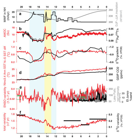 So far, reconstructions on the ENSO strength during abrupt climate changes (e.g., the Heinrich Event 1, the Bølling-Allerød warming and the Younger Dryas) are still lacking. These abrupt climate changes are thought to be related to variations in the Atlantic Meridional Overturning Circulation (AMOC) [134]. However, an enhanced ENSO variability in response to a weakening of the AMOC seems to be a robust feature in almost all the climate models [61,129] (Figure 4e, red; Figure 4g, blue). The models suggest that a meltwater pulse in the North Atlantic weakens the AMOC, shifts the ITCZ southwards and creates a more symmetric annual mean climate in the eastern equatorial Pacific. The more symmetric mean climate is associated with a weaker north–south difference in the SST and a weaker equatorial annual cycle, resulting an amplified ENSO through the nonlinear mechanism of frequency entrainment. The influence of north-south asymmetry and the shift of ITCZ may not be as sufficient during the LGM due to either only subtle southward-shift of the ITCZ [135], or the remote forcing of ice-sheets [121].