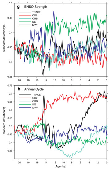 TRACE21 also simulates ENSO evolution during the entire last deglaciation [61] (Figure 4e, red), which is characterized largely by a precessional modulation, with an initial weakening at the early Holocene and a subsequent strengthening towards the late Holocene. There is pronounced millennial variability of ENSO intensity during the early deglaciation, associated with meltwater pulses in the North Atlantic. The meltwater forcing tends to intensify the ENSO amplitude, agreeing with a study using multiple models [129]. Furthermore, the presence of large continental ice sheets during the glacial period tends to suppress the ENSO variability, while the lower concentrations of GHG also at glacial time seem to strengthen it, resulting in a modestly reduced ENSO at the LGM relative to the late Holocene.