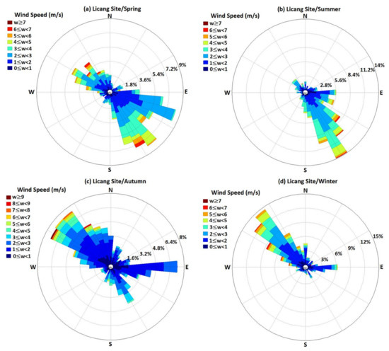 The dominant air pollutants also presented significant spatial heterogeneity at the four sites. PM10 concentration was higher and the number of days of PM10 dominance was larger at the Licang site than at the other three sites throughout the year, especially in spring and summer (Figure 5 and Figure 6). This was because there was some industrial dust and construction dust [19,27], as well as more wind at the Licang site in spring and summer (Figure 1) [42]. The Licang site is located in the northern foothills of Laoshan Mountain, and the dust transport from the north is also another important reason for this difference. The other three sites are closer to beaches (Figure 1), and the eastern or southern coastal winds are strong, which are a predominant reason for lower PM10 concentration there. PM10 was one of the major pollutants affecting air quality in China in every season [31,33]. PM10 pollution was mainly attributed to coal combustion and biomass burning in autumn and winter, photochemical reactions in summer, and crustal matter in spring in Xi’an China [70]. The PM10 concentration was larger in urban areas than in suburban areas in Fuzhou, and the discrepancy was significant between them [71].