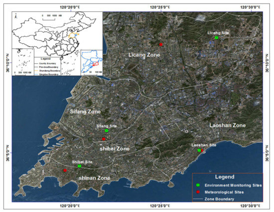 Considering the different natural conditions and economic functions in these four zones, we selected four environmental monitoring sites across the four zones, all built by the Qingdao Environmental Monitoring Center Station in this paper. The four meteorological monitoring sites (built by Qingdao Meteorological Bureau) located nearest to environmental monitoring sites were also selected. The names and locations of the environmental monitoring sites are Shibei (120.341389 E, 36.069889 N), Laoshan (120.353989 E, 36.085814 N), Sifang (120.366456 E, 36.104064 N), and Licang (120.385392 E, 36.184747 N). The spatial distribution of these environmental monitoring sites is shown in Figure 2.
