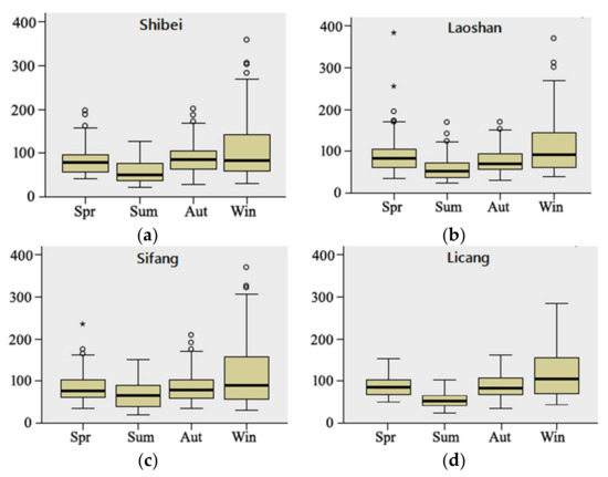 Box-plot of the Kruskal-Wallis rank-sum test for (a) Shibei site; (b) Laoshan site; (c) Sifang; (d) Licang.