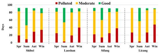AQI is a very important indicator for assessing AQ in urban areas [63], and we used it to analyze the spatiotemporal heterogeneity of AQ at four sites in the Qingdao urban area. The number of days in each AQ level (Figure 4) and AQI test results (Figure 3) show that AQ was best in summer and worst in winter in the Qingdao urban zones. Similar seasonal heterogeneity in AQ existed in most NCP cities because there are generally more emissions from coal combustion and biomass burning in winter [40,41]. For example, air pollution mainly occurred in winter and spring, and it was generally attributed to local primary emissions (e.g., coal combustion and vehicular, domestic, and industrial emissions) in winter in Qingdao [15,64]. The AQI was largest in winter (January and February) and smallest in autumn (September) in the Beijing-Tianjin-Hebei region [5]. The AQ was worst in spring and best in summer, and it subsequently became more serious in autumn and winter in Beijing [34].