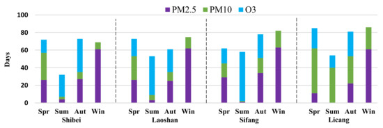 First, the temporal heterogeneity of the dominant air pollutants, in terms of the number of days on which each pollutant was dominant, was examined. The number of days on which PM10 was the dominant air pollutant was larger than 27, which was the largest among all the pollutants in spring, at all three sites, other than the Sifang site (Figure 5). In summer, the number of days on which O3 was the dominant air pollutant was larger than 25, which was the largest among all the pollutants at all three sites, other than the Licang site. The number of days on which PM2.5 was the dominant air pollutant was larger than 61, which was the largest among all the pollutants in winter at each site. The sum of days on which O3 and PM2.5 as the dominant air pollutant was larger than 51, which was the largest among all the pollutants at each site in autumn (Figure 5). In general, the dominant air pollutants were PM10 in spring, O3 in summer, O3 and PM2.5 in autumn, and PM2.5 in winter.