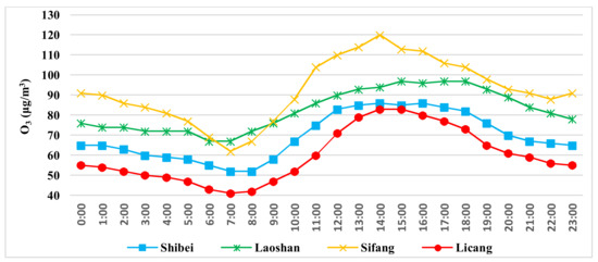 Finally, the spatial heterogeneity of the diel variation in concentrations of the pollutants was analyzed. As Figure 6 shows, the difference in the concentration of PM10 between daytime and night-time was lower at the Shibei site than it was at the other sites, and the concentration of PM10 remained near its midday high for a longer time at the Shibei site than it did at the other sites. At the Laoshan site, the concentration of PM10 stayed low at night for a longer time, the initial ascension time was later, and the peak time was later than at the other sites. The difference in the concentration of PM10 between daytime and night was higher at the Sifang site than at other sites, and the lengths of ascension time and descent time were nearly equal at the Sifang site. At the Licang site, the concentration of PM10 was significantly higher, the initial rise was earlier, and the peak time was earlier than at the other sites.