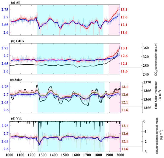 - Bauer, E.; Brovkin, V.; Claussen, M. Assessing climate forcings of the Earth system for the past millennium. Geophys. Res. Lett. 2003. [Google Scholar] [CrossRef]